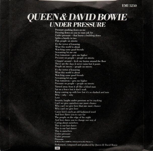 Under Pressure[gallery | 1986 UK live promo | 1999 Rah remix]#1, 26 October 1981. Released in the UK, USA, Japan, Netherlands, Germany, France, Italy, Spain, Portugal, Brazil, Mexico, Columbia, Australia, New Zealand, Canada, Hong Kong, and possibly Yugoslavia, Chile and Argentina. Reissued on the 3" CD format in the UK on 5 December 1988, and as part of a boxed set in Germany in 1988 and Japan in 1991. | |