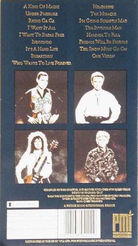 | Video 1: 01. Killer Queen (Photo montage) 02. Bohemian Rhapsody 03. You're My Best Friend 04. Somebody To Love 05. Tie Your Mother Down 06. We Are The Champions 07. We Will Rock You (slow) 08. We Will Rock You (fast) 09. Spread Your Wings 10. Bicycle Race 11. Fat Bottomed Girls 12. Don't Stop Me Now 13. Love Of My Life (live) 14. Crazy Little Thing Called Love 15. Save Me 16. Play The Game 17. Another One Bites The Dust 18. Flash 19. Keep Yourself Alive (bonus video) 20. Liar (bonus video) 21. Killer Queen (bonus video) 22. Now I'm Here (bonus video) Video 2: 01. The Show Must Go On (montage to edit of album version) 02. A Kind Of Magic 03. Under Pressure 04. Radio Ga Ga 05. I Want It All 06. I Want To Break Free 07. Innuendo 08. It's A Hard Life 09. Breakthru' 10. Who Wants To Live Forever 11. Headlong 12. The Miracle 13. I'm Going Slightly Mad 14. The Invisible Man 15. Hammer To Fall 16. Friends Will Be Friends 17. The Show Must Go On 18. One Vision 19. God Save The Queen (credits)